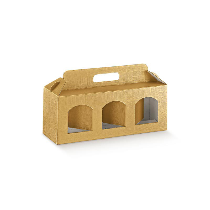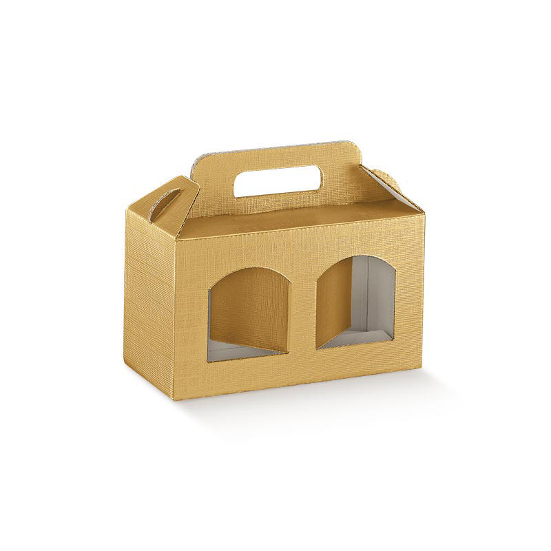 Caixa em cartão para 2 frascos, com janela, em cartão dourado. Caixa resistente de fabrico italiano.