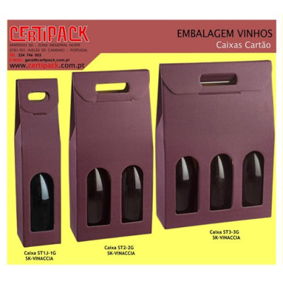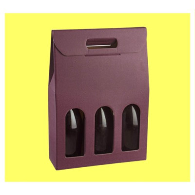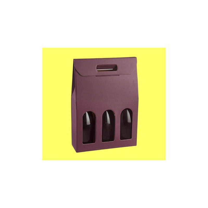 Caixa em cartão para 3 garrafas com janela, na cor grená/vinho. Caixa de fabrico italiano, muito resistente. Embalagem ideal para transporte e oferta de garrafas...