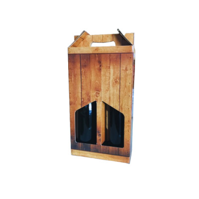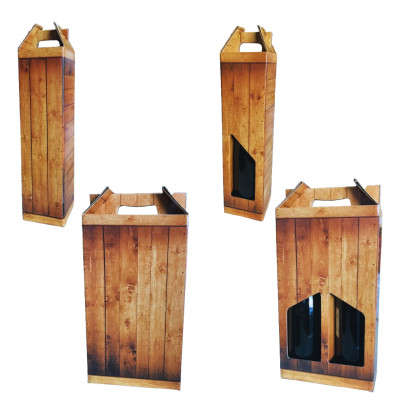 Caixa em cartão PREMIUM com impressão de madeira para 2 garrafaS com janela e com pega.