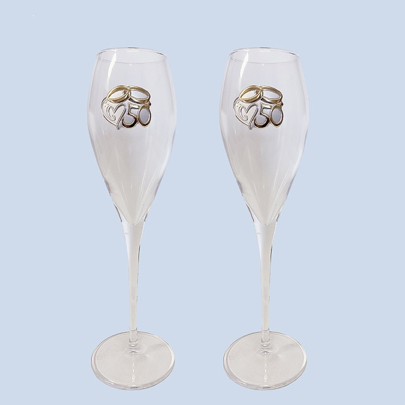 Conjunto de Flutes em vidro com aplicação de placa (50 Anos) bilaminada a prata.