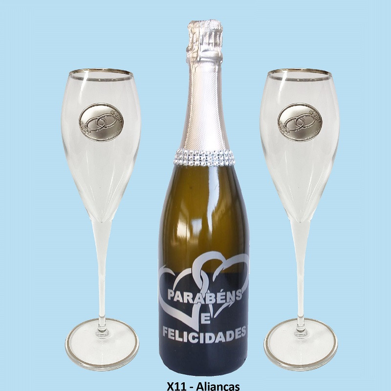 Conjunto de Flutes em vidro com aplicação de placa (Alianças) bilaminada a prata e garrafa de espumante.