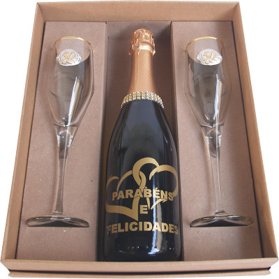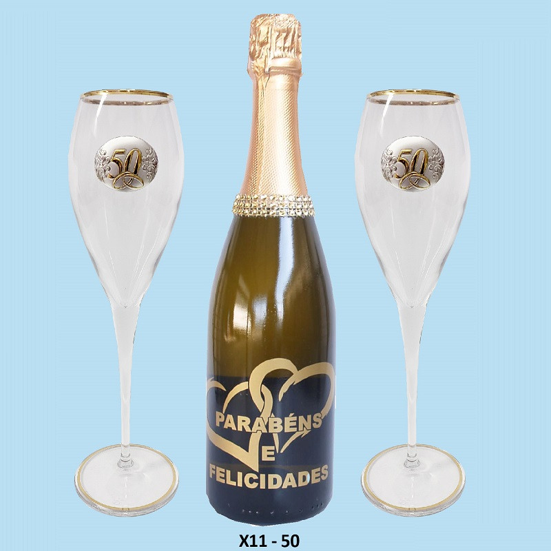 Conjunto de Flutes em vidro com aplicação de placa (50 anos) bilaminada a prata e garrafa de espumante.