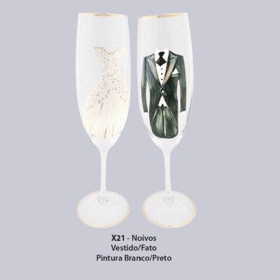 Conjunto de Flutes pintados à mão com noivos, um com vestido de noiva e outro com fato de noivo(branco e preto).