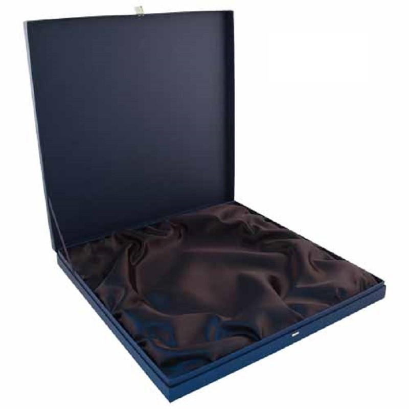 Estojo em Cartão Azul, interior c/ Corte redondo (Diam. 28cm) forrado com cetim azul e com fecho dourado
