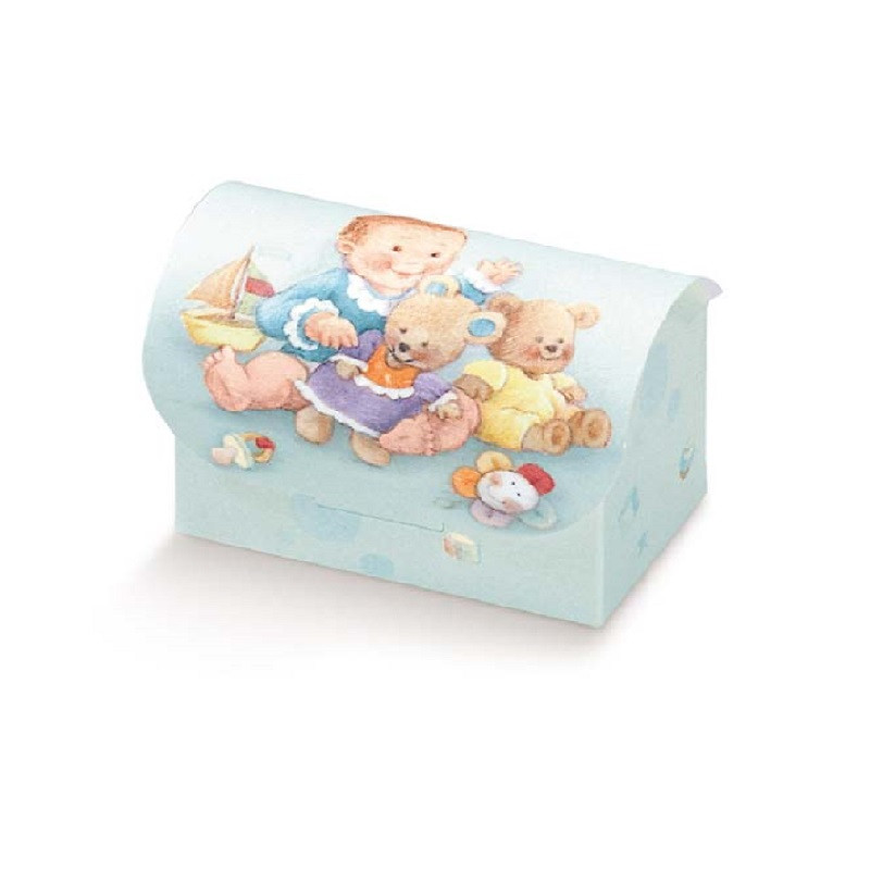 Saca fantasia de bebe, em forma de baú, em cartolina em tons de azul com menino e ursos. Embalagem ideal para ofertas a crianças e para as festas de aniversário e outros eventos infantis...