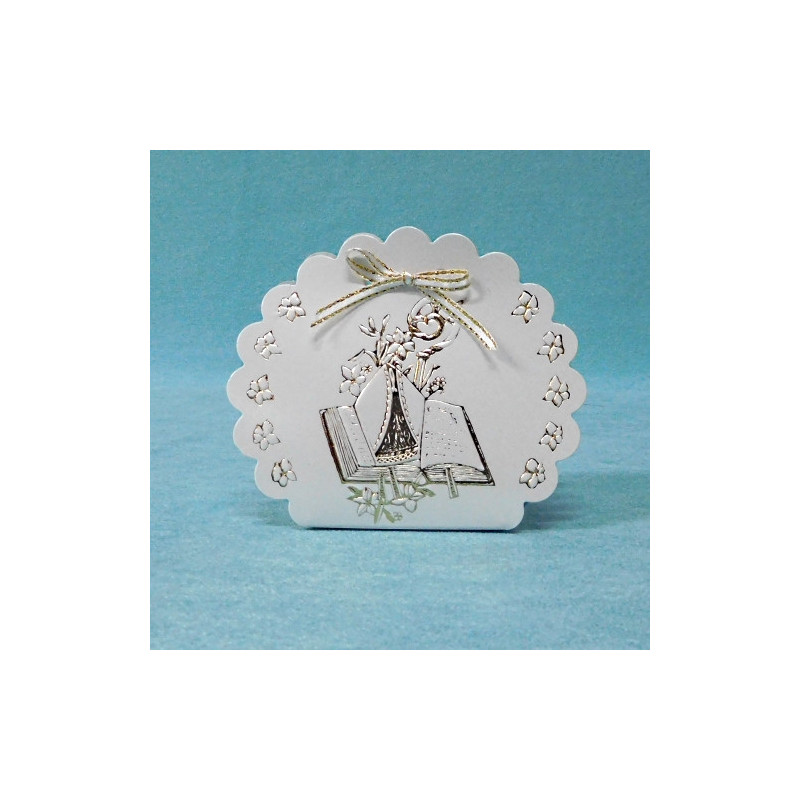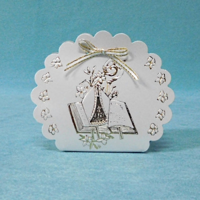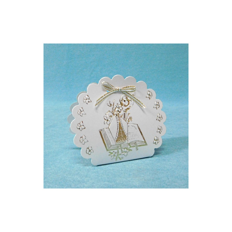 Saca recortada tipo nuvem, com fantasia comunhão em tons dourados. Embalagem ideal para ofertas em comunhões e outros eventos ...