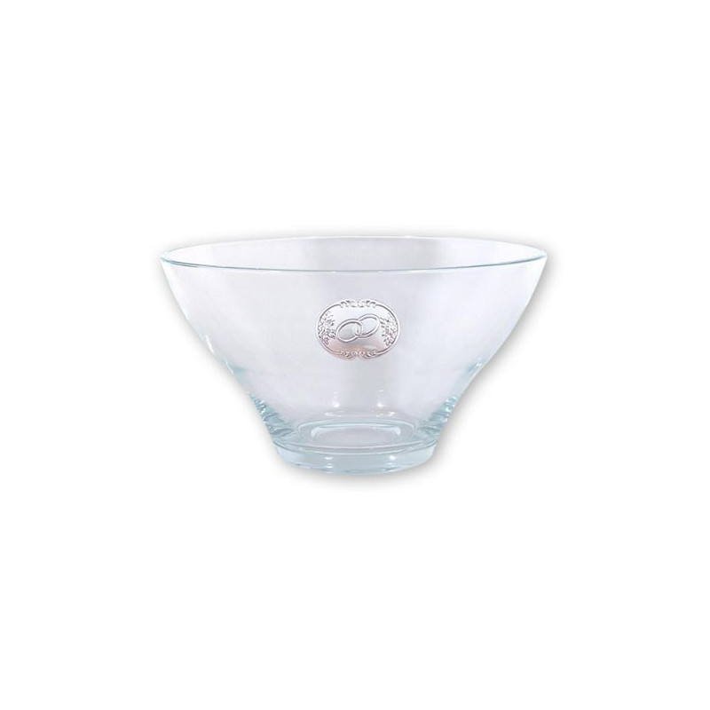Fruteiro em vidro com aplicação de placa bilaminada a prata Alianças.