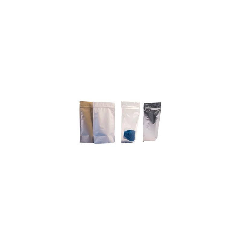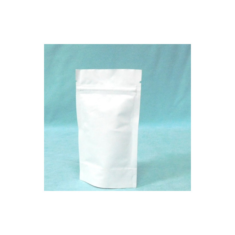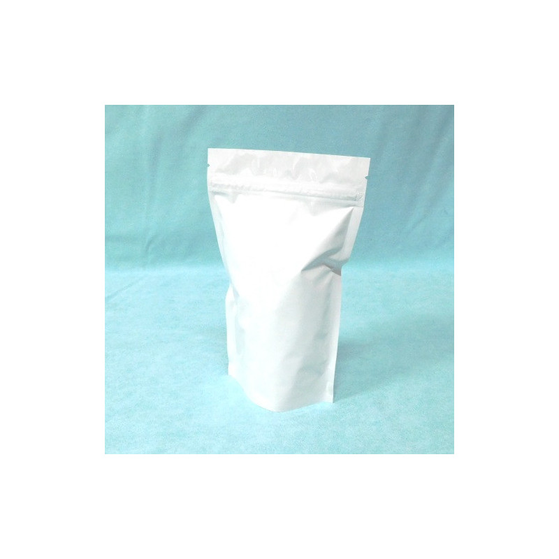 Saco stand up, em papel branco, com interior aluminio. Embalagem com fecho zip.