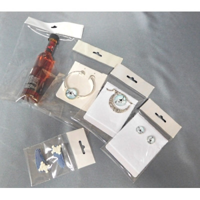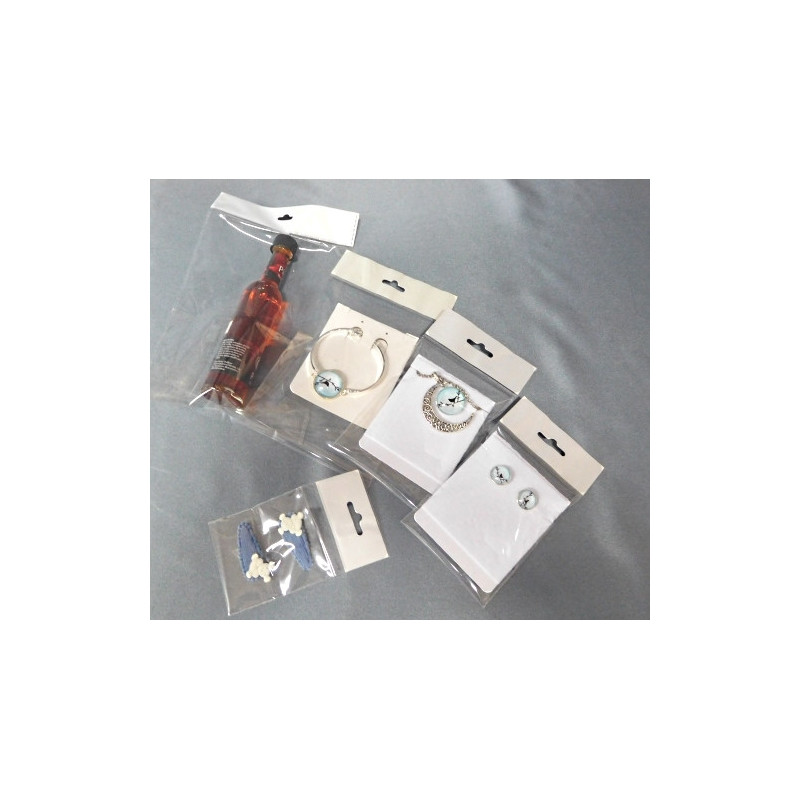 Saquetas em celofane transparente, com pala adesiva e sistema de suspensão reforçado (com eurofuro). Ideal para apresentação dos produtos nos expositores. Embalagem adequada para embalar e expor fotos, postais, bijuterias, joias, biscoitos, bombons, chás, produtos gourmet, etc...