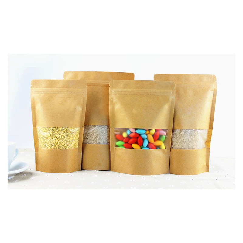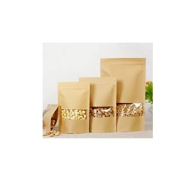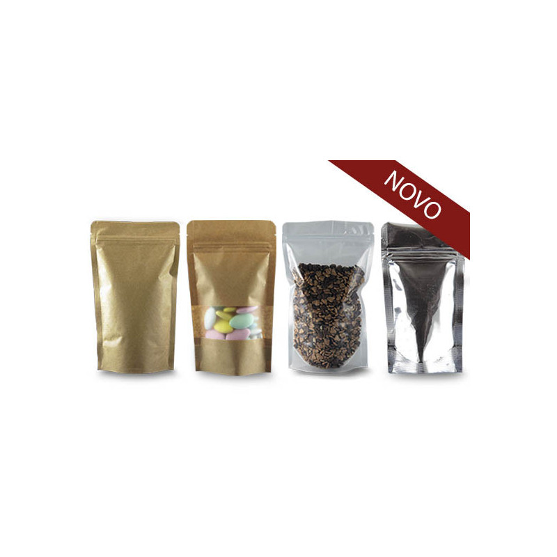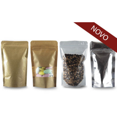 Saco stand up, em papel castanho kraft, com janela transparente. Embalagem com fecho zip.