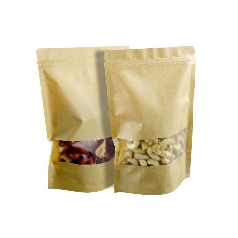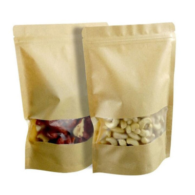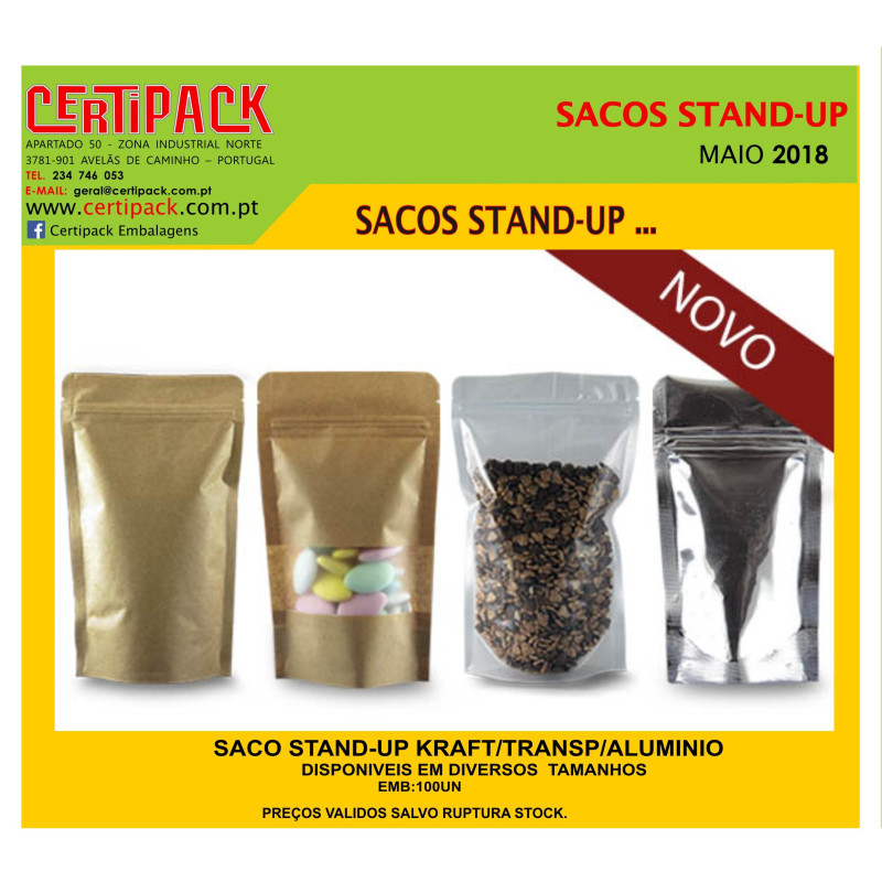 Saco stand up, em papel castanho kraft, com janela transparente. Embalagem com fecho zip. Mais uma solução de embalagem para diversos sectores...