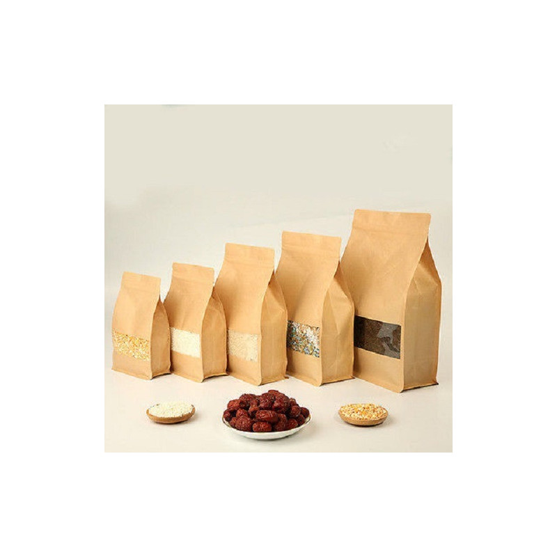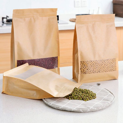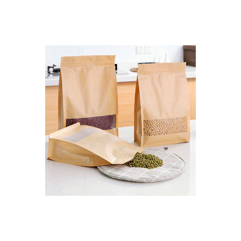 Saco stand up box kraft com janela, com fecho zip hermético, fundo retangular.