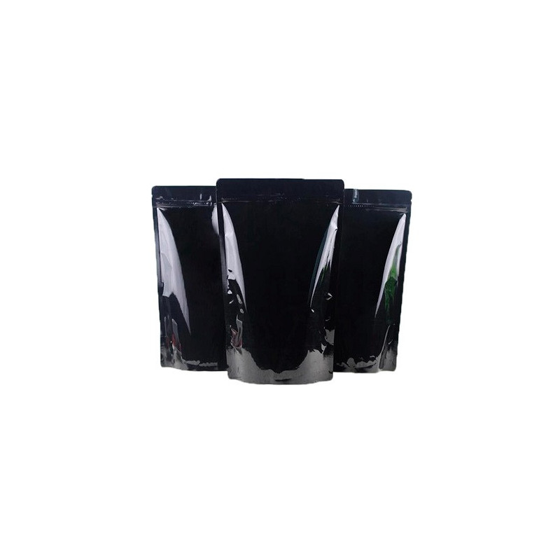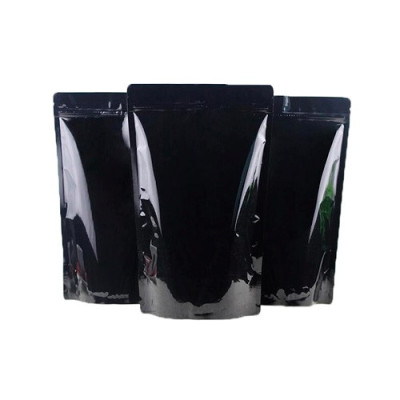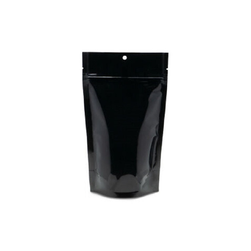 Saco stand up preto brilante. Embalagem com fecho zip.