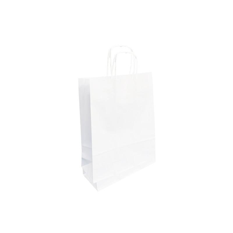 Saco em papel kraft liso branco, com asa retorcida em papel.