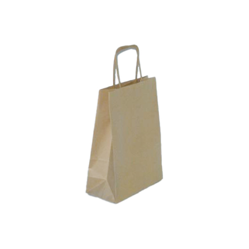 Saco em papel kraft castanho vergê, com asa retorcida em papel. Sacos em Papel com gramagem aproximada 115grs.
