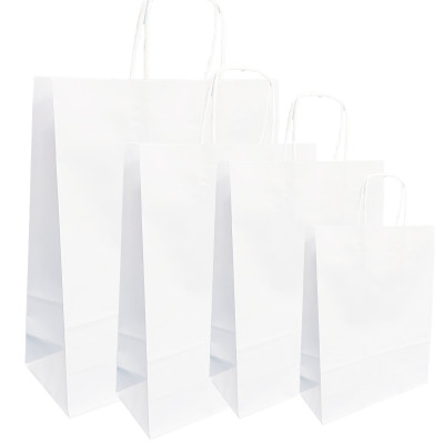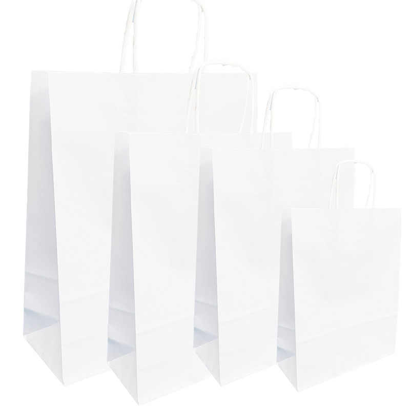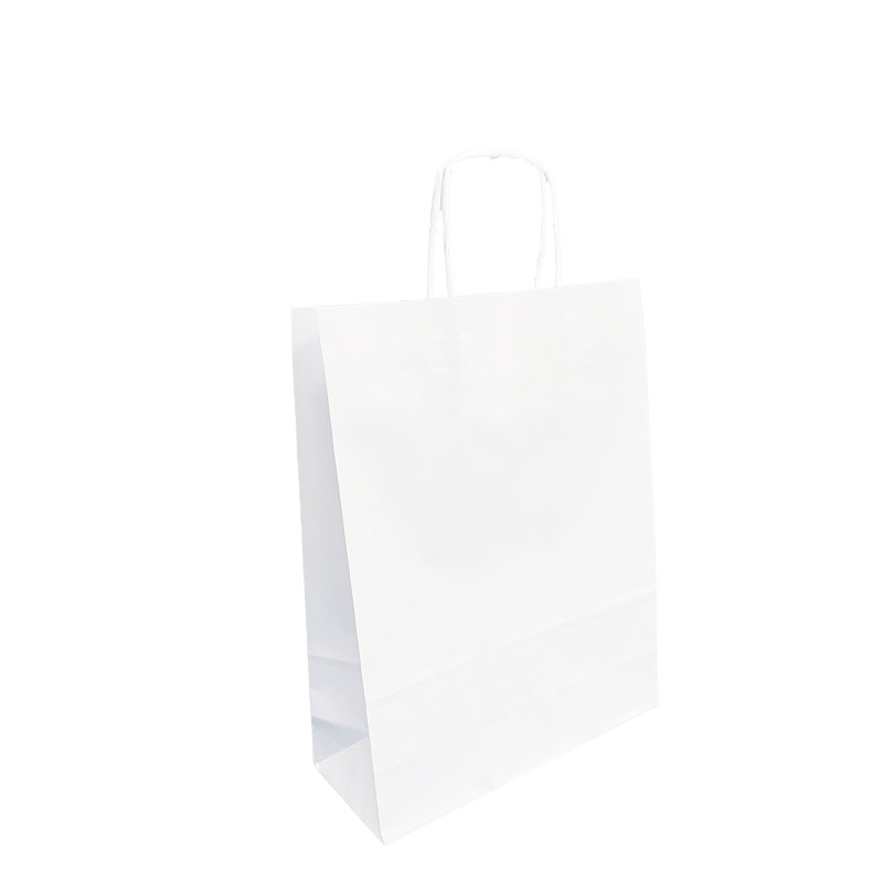Saco em papel kraft liso na cor branco, com asa retorcida em papel. Sacos em Papel com gramagem aproximada 100grs.
