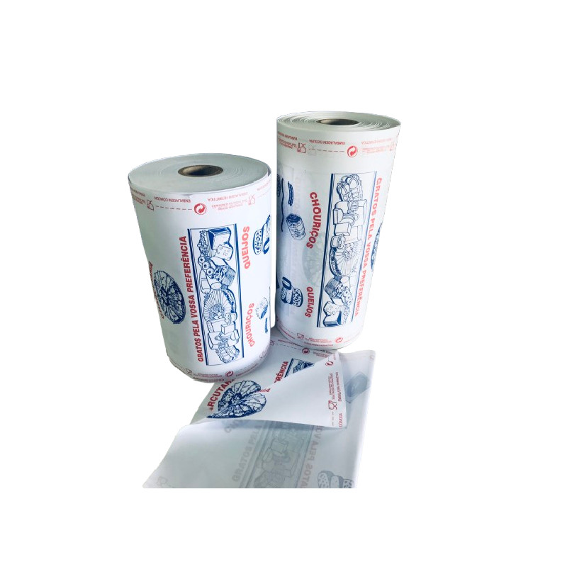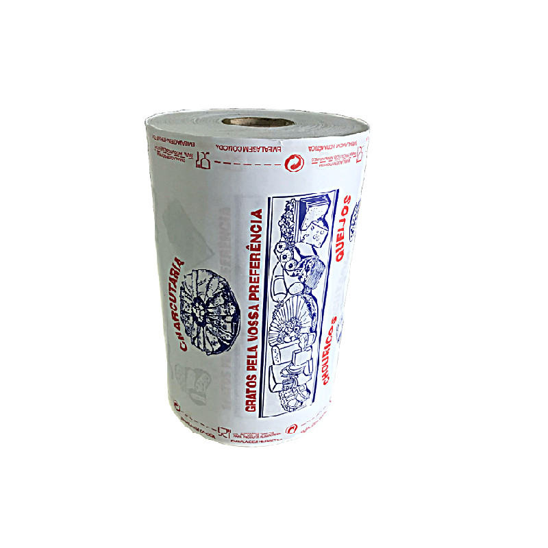 Bobine de papel plastificado para charcutaria com impressão genérica.
